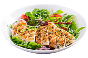 Grilled chicken or Angus Beef patty with cottage cheese, egg, and assorted fruit